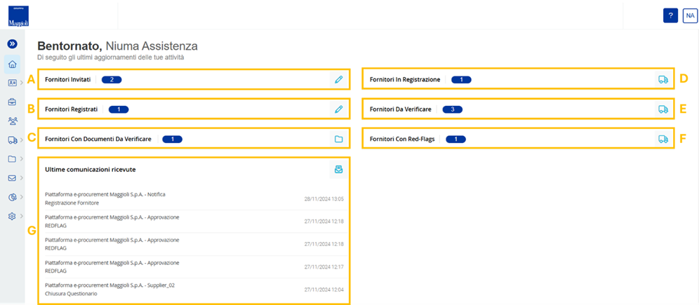 In addition, it is possible to keep track of the latest received communications (G) that the portal sends to the user and supplier, ordered from most recent to least recent.