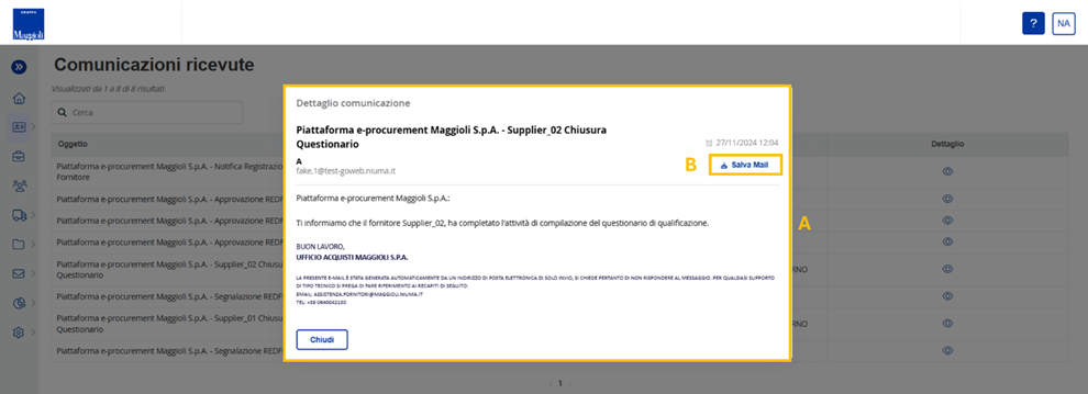 By clicking on the wink icon, located inside the ‘Detail’ column, the system will open a pop-up (A) containing the detail of the indicated communication (ref. Figure 7).