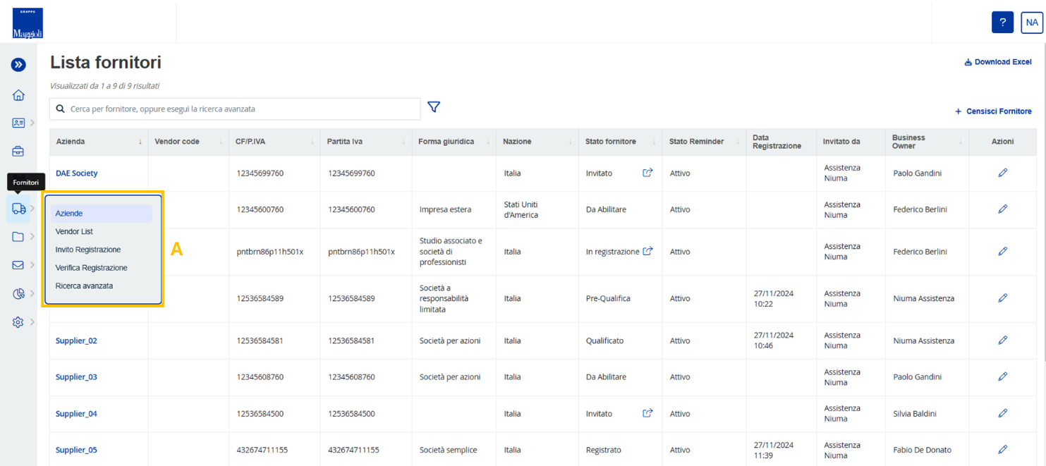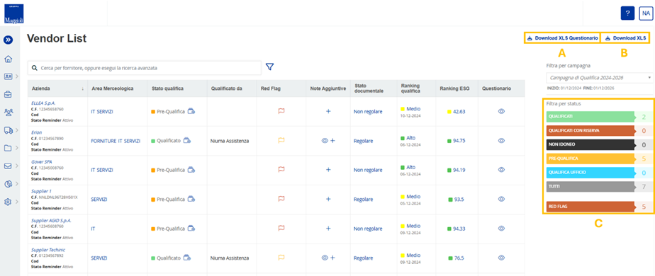 - Vendor List: this section shows all suppliers who have completed the qualification questionnaire and entered the required documentation. From the ‘Qualification Ranking’ column, by clicking on the relevant ranking, you can access the score card and view the scores obtained by the supplier. Instead, by clicking on the wink icon in the ‘Questionnaire’ column, it is possible to view the completed questionnaires; furthermore, by clicking on the ‘Download XLS Questionnaire’ button (A), the user can directly download the questionnaire in excel format.