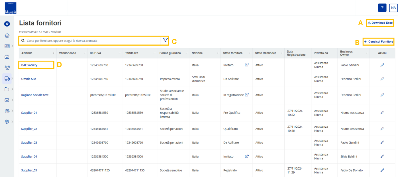 By clicking on the specific company name (D), you can view the complete supplier master data. Whereas if the user wishes to census a supplier on the platform, without necessarily sending a registration invitation, he may click on the ‘Census supplier’ button (B).