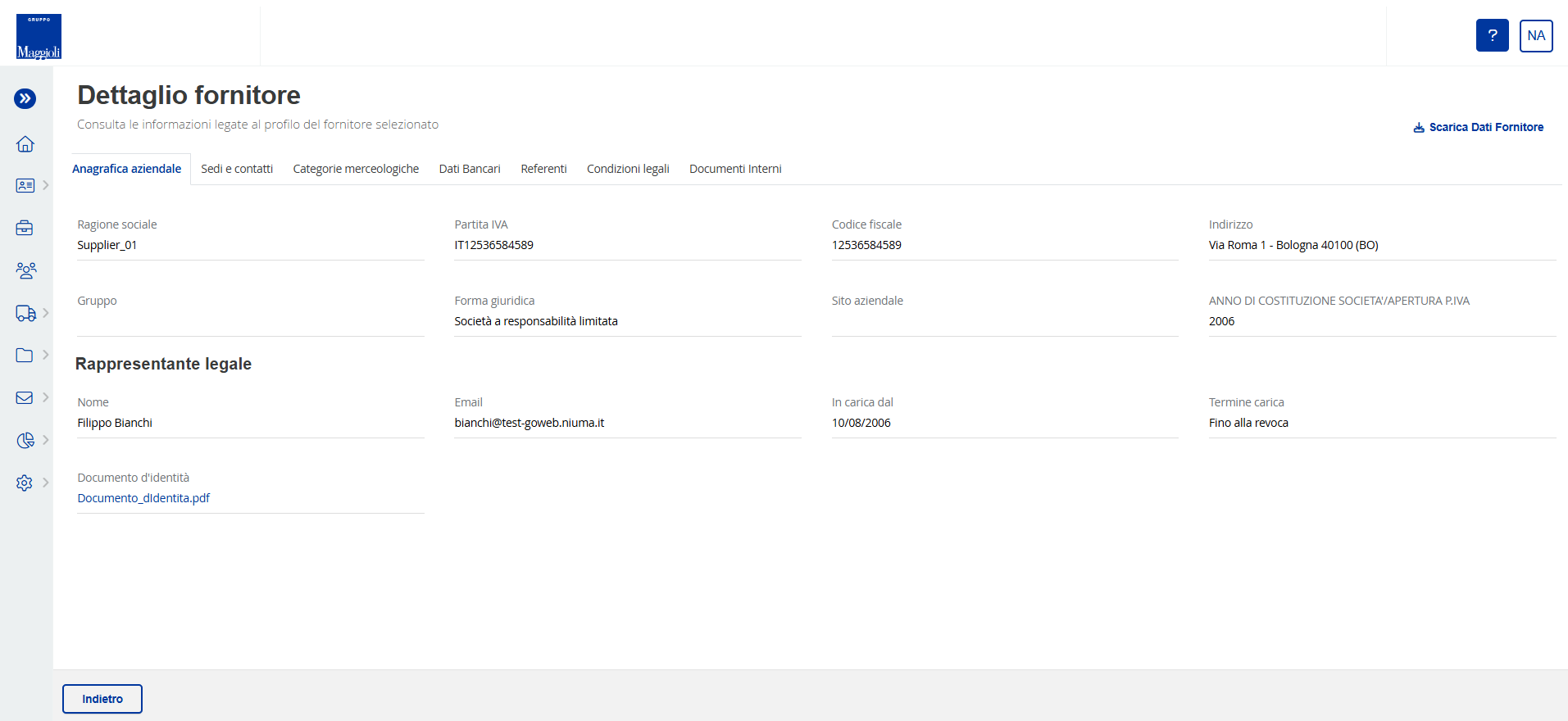 Within the ‘Supplier details’ page (ref. Figure 3) the internal user can view the information entered by the supplier during the registration phase: personal details, locations and contacts, product categories, bank details and contact persons. Furthermore, within the same area it is possible not only to consult the legal conditions accepted by the supplier, but also to enter any documents for internal use.