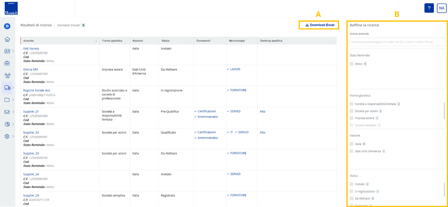 - Advanced Filter: in this section it is possible to perform specific searches on the supplier list by using the appropriate search filters (B) (ref. Figure 7):