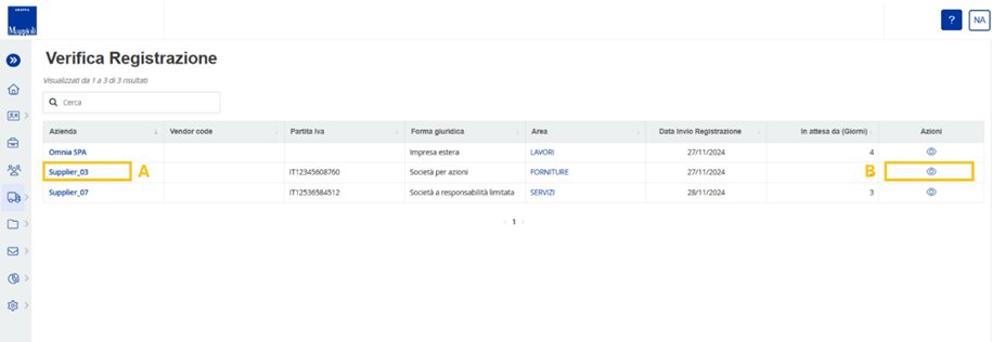 - Registration verification: in this area you can view the list of all suppliers who have completed the registration process. For each supplier it is possible to view: company name, vendor code, VAT number, legal form, area, the date on which the supplier sent the registration process, and the waiting days for confirmation of registration.