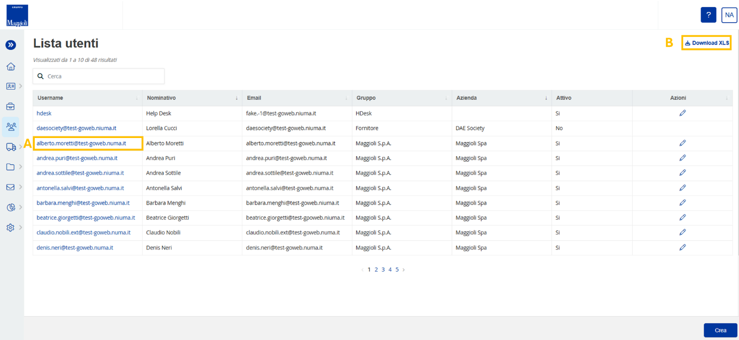 Il sistema permette all’utente di fare un’estrazione di tutti gli utenti censiti sul portale, cliccando sul pulsante “Download XLS” (B).