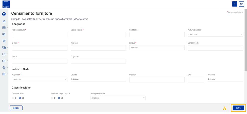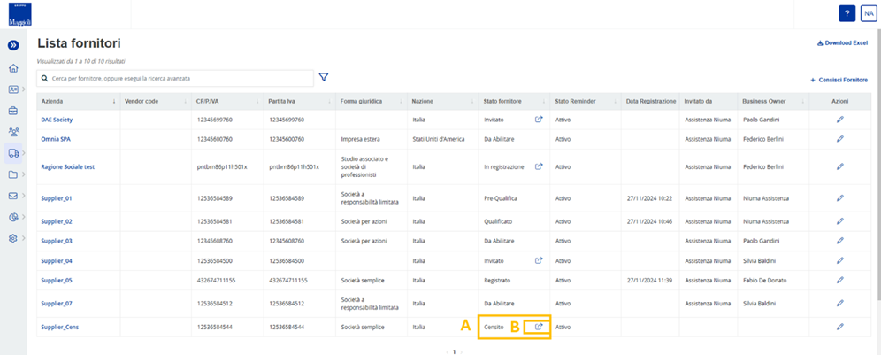 Al click sul pulsante “Salva” (A) in basso a destra, il sistema permette il salvataggio del fornitore all’interno della tabella, visibile nella sezione Azione con lo stato “Censito” (A) (rif. Figura 3).