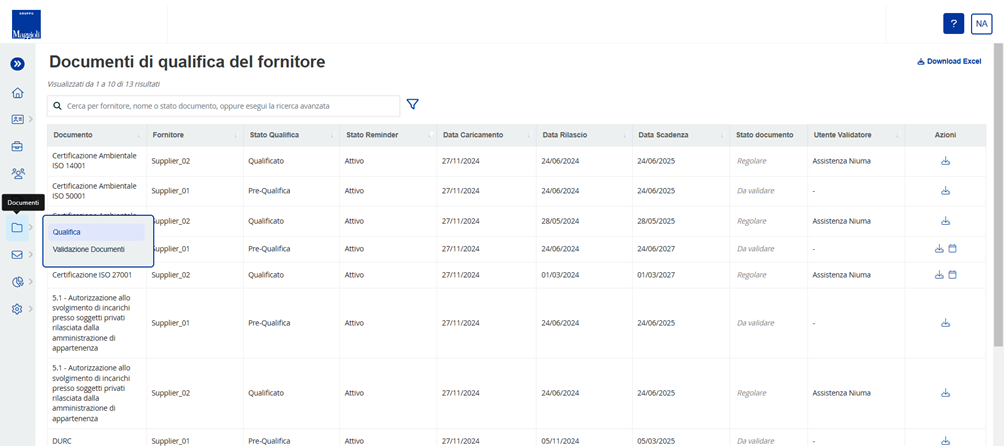 - Qualifica: questa sezione contiene tutti i documenti caricati sul portale di e-procurement dal fornitore. L’elenco associa ad ogni documento presente nel portale: il fornitore dal quale è stato caricato, lo stato di qualifica del fornitore, la data di caricamento del documento a sistema, la data in cui il documento è stato rilasciato al fornitore, la data di scadenza del documento, lo stato, l’utente che ha validato il documento e lo stato reminder.
